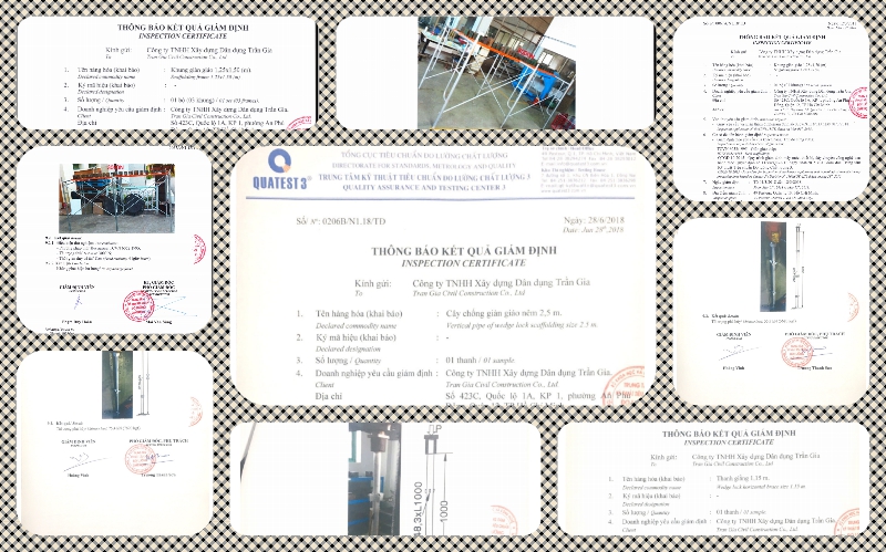 Sản phẩm của Giàn Giáo Trần Gia được kiểm định bởi Trung Tâm Quates3, trung tâm uy tín trong kiểm định chất lượng sản phẩm. Kiểm định sản phẩm nhằm đem đến cho quý khách hàng sự yên tâm và hiệu quả làm việc cao hơn. Trần Gia tập trung vào đầu tư chất lượng sản phẩm, sản xuất ra những sản phẩm chất lượng cao. Nhằm giúp công trình của Quý Khách Hàng thi công an toàn, chính xác và tiết kiệm thời gian hơn.